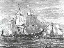 Bombardement du navire royal La Provence par les batteries d'Alger, le 3 août 1829. Gravure de Louis Le Breton