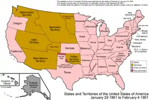 - le Territoire du Dakota est séparé du Territoire du Nebraska ; il inclut les terres non organisées restantes du Territoire du Minnesota. Le Territoire du Dakota est constitué des actuels Dakota du Nord et Dakota du Sud, ainsi que de la majeure partie du Montana et du nord du Wyoming. Le Territoire du Nebraska est constitué alors du Nebraska et du sud-est du Wyoming[2]. Le Territoire du Nevada est séparé du Territoire de l'Utah; il correspond au nord-ouest de l'actuel Nevada ; la frontière est était fixée au 39e méridien à l'ouest de Washington (district de Columbia)[3].