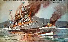 - Nuit du 8 au 9 février : attaque surprise des Japonais contre la flotte russe de Port-Arthur. Le Japon coule trois navires russes (bataille de Chemulpo) sans déclaration de guerre, qui n’arrive que trois jours après[38]. Déclenchement de la guerre russo-japonaise entre le Japon et la Russie (fin en 1905). Les troupes japonaises engagent une lourde opération de débarquement puis sont bloquées pendant sept mois sur la côte, à Dalian (Dairen ou Port-Arthur).