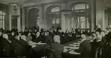 - 18 janvier : ouverture de la conférence de la Paix[39] au Quai d’Orsay à Paris (1919-1921) qui réunit les représentants des 27 États victorieux de la Première Guerre mondiale afin de négocier les traités de paix et de créer la Société des Nations. Georges Clemenceau en est élu président, les autres représentants des grands pays sont le Britannique David Lloyd George, l’Américain Thomas Woodrow Wilson et l’Italien Vittorio Orlando (Conseil des Quatre).