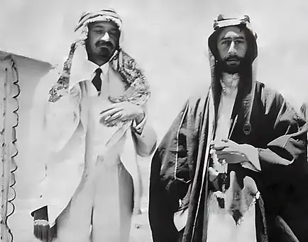 - 1er janvier : mémorandum de Faysal[37]. La Grande-Bretagne, qui considère le Hedjaz comme une puissance belligérante faisant partie du camp des vainqueurs, fait pression pour que l’émir Faysal soit le seul représentant des Arabes à la conférence de Versailles. Elle interdit aux Palestiniens, aux Mésopotamiens et aux Égyptiens d’envoyer une délégation. Encadré par des officiers britanniques (T. E. Lawrence), Faysal expose les revendications arabes, nettement favorables à l’influence britannique : il propose une confédération d’États sous la direction de son père Hussein, composée de la Syrie, de l’Irak, de la Palestine, du Hedjaz, du Yémen. En Syrie et en Irak, Faysal demande l’appui de conseillers étrangers, sans en préciser la nationalité. En Palestine, il estime que le conflit potentiel entre Juifs et Arabes nécessite une tutelle étrangère directe. Il ne fait pas mention des revendications françaises au Liban et en Syrie.
