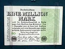 Billet d’un million de marks émis le 9 septembre. Hyper inflation en Allemagne : alors qu’un mark-or valait 46 marks-papier en janvier 1922 il en vaut 84 000 en juillet 1923, 24 millions en septembre, 6 milliards en octobre et 1 000 milliards à la fin de l’année 1923.