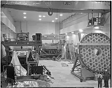 Le miroir de 20 tonnes et 200 pouces du futur télescope Hale après son arrivée à Pasadena, en Californie, après un voyage en train à travers le pays depuis Corning, (État de New York).