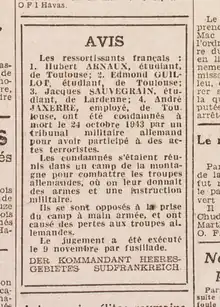 - 8 février : Jean-Marie Arthus (15 ans en 1940), Jacques Baudry (18 ans), Pierre Benoît (15 ans), Pierre Grelot (17 ans) et Lucien Legros (16 ans) sont fusillés par la gendarmerie française. On les appellera les cinq martyrs du lycée Buffon[12].
