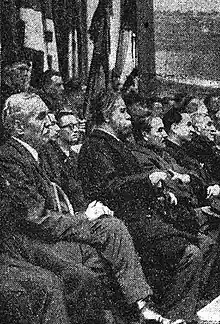 Meeting du Front révolutionnaire national au Vél'd'Hiv le 11 avril 1943 : Georges Claude, de Châteaubriant, Marcel Déat, Marcel Bucard, Paul Chack.