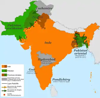- La question des 554 États princiers est facilement résolue à trois exceptions près : le Junâgadh, le Hyderabad et le Cachemire. Le Junâgadh, dans le Gujarat, est un petit État qui a un souverain musulman et une population de 700 000 habitants à majorité hindoue. Un soulèvement populaire permet à l’Inde de l’intégrer dans son territoire le . Le nizam, souverain musulman d’Hyderabad qui règne sur 17 millions d’habitants en majorité hindous, refuse de rejoindre l’Inde. Le gouvernement indien prétextera des menées d’une milice musulmane qui terrorise la population pour lancer une opération militaire qui se termine par la capitulation d’Hyderabad le . Le maharadjah du Cachemire signe un accord de statu quo en août. Devant l’invasion des tribus pathan venues du Pakistan le 22 octobre, il opte pour l’Inde le 26 octobre. L’intervention des troupes indiennes contre les Pathan dégénère en guerre contre le Pakistan (1947-1949). L’Inde perd le Gilgit, rattaché de facto au Pakistan[56],[57].