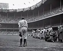 Prix Pulitzer de photographie : Nat Fein (en), photographe au New York Herald Tribune pour Babe Ruth Bows Out (en), représentant le joueur de baseball Babe Ruth au Yankee Stadium à New York, à la retraite depuis 1935 et portant son maillot retiré no 3.