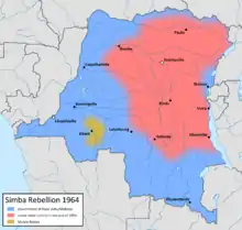 En rouge, le territoire contrôlé par la rébellion Simba à la fin de 1964.