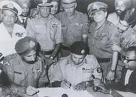 - 15 décembre : le général en chef des troupes du Pakistan oriental demande un cessez-le-feu à l’ONU et signe sa reddition[60]. Indépendance du Bangladesh. Islamabad lance toutefois plusieurs offensives dans le Cachemire, le Pendjab et le Rajasthan. Les Indiens contre-attaquent sans obtenir de résultats décisifs.