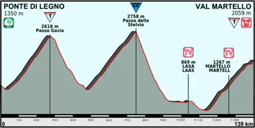 La 19e étape du Tour d'Italie 2013 devait se dérouler le vendredi entre Ponte di Legno et Val Martello. Originellement, d'une distance de 139 km, elle devait voir les coureurs franchir le plus haut sommet (la Cima Coppi) de cette 96e édition du Tour d'Italie, le col du Stelvio situé à 2 758 m d'altitude. Ce dernier correspondait à la deuxième ascension de la journée, après le col de Gavia (1re catégorie) et avant la montée finale sur Val Martello (1re catégorie). En raison des mauvaises conditions météorologiques et de la neige, les organisateurs ont pris la décision la veille au soir de remplacer les deux premières ascensions par le passo del Tonale et le passo Castrin[1] : l'étape est rallongée à 160 km. Finalement, le matin du départ, l'étape est annulée pour les mêmes raisons par les organisateurs[2].