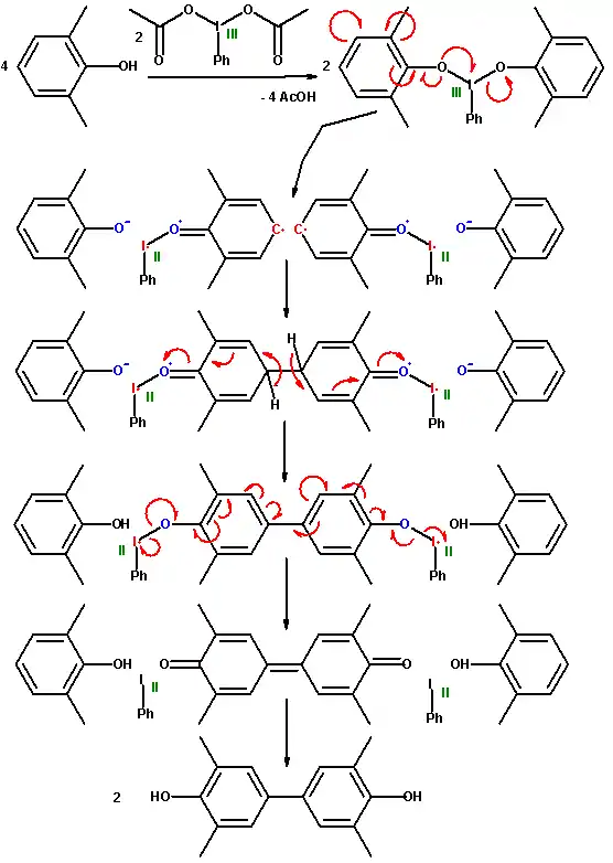 La première étape du mécanisme réactionnel proposé voit la substitution des groupes acétyle liés à l'iode par des groupes phénol. Ce complexe se dissocie en un radical anionique aryle et un groupe phénoxy. Les deux radicaux aryle forment une liaison covalente carbone–carbone avant d'éliminer deux protons, conduisant à une aromatisation. Cela donne une diphénoquinone, à la suite d'une oxydation à quatre électrons. Le biphénol peut être obtenu par médiamutation de la quinone avec le xylénol déjà présent. À l'issue de la séquence de réactions, le diacétate d'iodobenzène est réduit en iodobenzène C6H5I.
