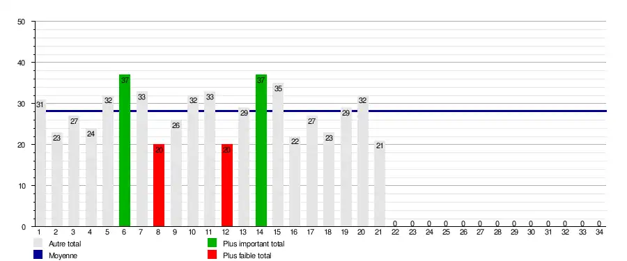 | Journée → | 1 | 2 | 3 | 4 | 5 | 6 | 7 | 8 | 9 | 10 | 11 | 12 | 13 | 14 | 15 | 16 | 17 | 18 | 19 | 20 | 21 | 22 | 23 | 24 | 25 | 26 | 27 | 28 | 29 | 30 | 31 | 32 | 33 | 34 |