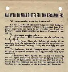 Le , les partisans de l'Armée populaire de libération nationale grecque (ELAS) tendent une embuscade et tuent le général allemand Franz Krech et trois autres officiers allemands, à Molái en Laconie. En représailles, les autorités d'occupation allemandes annoncent, par proclamation, l'exécution de 200 communistes, le , ainsi que l'exécution de tous les hommes trouvés, par les troupes allemandes, en dehors de leurs villages, sur la route Sparte-Moláoi. En outre, la proclamation allemande rapporte que « sous l'effet de ce crime, des volontaires grecs ont, de leur propre initiative, tué 100 autres communistes »[1],[2].