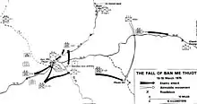 Au petit matin du 10 mars 1975, des roquettes lourdes et des tirs d'artillerie sont tombés sur Ban Me Thuot et des tirs de mortier ont frappé l'aérodrome de Phung Duc à l'est. Le bombardement a été suivi par des assauts d'infanterie et de sapeurs contre le dépôt de munitions sur la route locale 1 à l'ouest de la ville, la 2e compagnie du 225e bataillon de RF sur la colline 559 au nord-ouest de la ville, et le quartier général du sous-secteur à l'aérodrome de Phung Duc. Toutes les attaques sont repoussées et les pertes des PAVN sont lourdes. Juste avant quatre heures ce matin-là, le 3e bataillon du 53e régiment subit une lourde attaque à l'aérodrome et des chars PAVN sont aperçus au nord-ouest de la ville. Pendant ce temps, les attaques dans la province de Quang Duc se poursuivent, le 259e bataillon de la RF repoussant l'infanterie PAVN sur la route 12 entre Dak Song et Duc Lap et les Rangers tenant bon à Kien Duc et Gia Nghia. Le 15 mars, les défenseurs assiégés de Kien Duc sont finalement débordés[8]:150.
