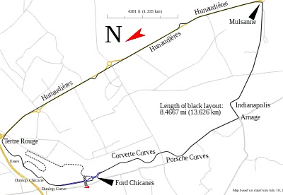 La piste, mesurant 13,626 km[16], emprunte une partie du circuit Bugatti et comporte une grande partie de route nationale. Les passages les plus célèbres sont les virages du Tertre Rouge, Mulsanne, Arnage et la ligne droite des Hunaudières, longue de presque 6 km où les prototypes maintenaient auparavant une vitesse de près de 400 km/h pendant une minute. Cette portion du circuit a été divisée en trois lignes droites par l'installation de deux chicanes en 1990. Ces chicanes ont pour but de limiter la recherche de la vitesse maximale par des réductions d'appuis aérodynamiques trop importantes et de limiter par conséquent les différences de vitesse entre concurrents. L'envol de certains véhicules était dû à la géométrie de la piste avec un changement de plan qui pouvait créer un décrochage aérodynamique suivant leurs configurations et réglages aérodynamiques. La bosse a été aplanie pour l'édition 2001.