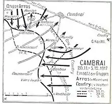 Au début de 1917, l'armée participe à la retraite vers la ligne Siegfried (→Opération Alberich) et, après avoir transféré l'AOK 1, tient approximativement le front est d'Arras-Queant (avec le 14e corps de réserve)-Bellicourt-Saint-Quentin (avec le 9e corps d'armée (de)). Le 20 novembre 1917, l'aile droite de la 2e armée se trouve dans le champ d'attaque principal de la 3e armée britannique pendant la bataille de chars de Cambrai. Le 14e corps de réserve perd un peu de terrain, mais parvient à se maintenir dans l'avancée occidentale de Cambrai. Le général von der Marwitz mène une contre-attaque à partir du 30 novembre : le groupe Arras attaque entre Moeuvres et Bourlon, le groupe Caudry (13e corps d'armée (de)) et Busigny (23e corps de réserve) mènent des attaques de diversion du sud à Marcoing via Banteux à Vendhuille. Les groupes du sud réussissent à avancer de huit kilomètres sur une largeur d'environ 16 kilomètres. Le groupe Arras qui arrive plus tard a moins de succès avançant de quatre kilomètres sur une largeur de dix kilomètres le 6 décembre 1917.