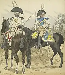 Deux cavalerie du 2e régiment de dragons légers (à droite) en 1804. Les cavaliers de gauche appartiennent au 1er régiment. | |