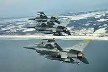 Trois General Dynamics F-16 appartenant respectivement à la Fifth Air Force, au 35th Fighter Wing et au 14th Fighter Squadron en formation au-dessus de Misawa Air Base.