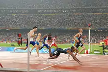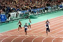 Après le départ, le sprinteurs accélèrent dans le virage. Au fur et à mesure que la vitesse s'accroît, la force centrifuge augmente. Afin de compenser cela, les sprinteurs se penchent vers l'intérieur de la piste.