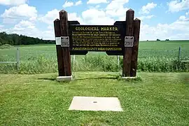 Un petit jardin public y avait été aménagé pour le signaler aux visiteurs, et un marqueur géographique y avait été scellé dans le sol, avec un panneau explicatif installé à côté, par la commission des parcs du comté de Marathon. Le panneau indiquait[3],[8],[9] :