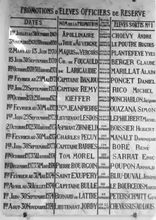 - Après avoir été semble t-il la règle jusqu'en 1939 pour la totalité de la promotion, ensuite seuls les mieux classés sortent sous-lieutenants après cette date, d'abord très peu en proportion au nombre d'aspirants, puis la proportion augmente très nettement, pour cesser brutalement fin 1972 avec la promotion « Asp. Zirnheld » qui n'en compte aucun. Huit promotions plus tard on retrouve un S-Lt pour 110 Asp. dans la promotion « Lt Jordy » en 1974 (voir l'illustration ci-dessous représentant une plaque murale listant des promotions d'EOR au PC du 4e Bat.)