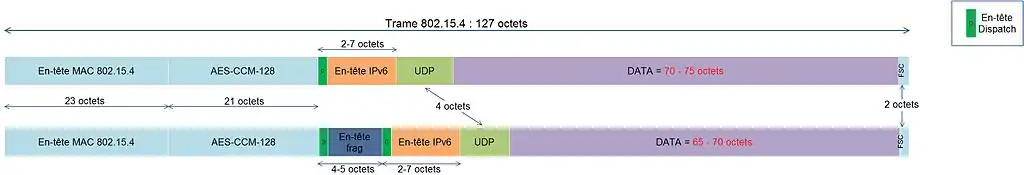 En 802.15.4, la taille maximale du PSDU (de l'anglais Physical layer Service Data Unit, « Unité de données service de la couche physique ») est de 127 octets[7]. Avec les 25 octets de la sous-couche MAC (sans sécurisation)[8], il en résulte 102 octets au niveau liaison. En ajoutant la sécurisation de la couche de liaison de données (AES-CCM-128)[9], il ne reste que 81 octets disponibles au niveau IP. Il faut également tenir compte de la surcharge due aux en-têtes d'IPv6 (40 octets)[10], des éventuels en-têtes d'extension, d'UDP (8 octets)[11] ou de TCP (20 octets)[10]. Finalement les données utiles sont peu élevées (33 octets sur UDP et 21 sur TCP, voir figure ci-dessous) et ne permettent pas de respecter les spécifications d'IPv6 qui imposent un MTU minimal de 1 280 octets[12].