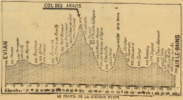 - Henri Desgrange, « En tête par 4 secondes en haut des Aravis, René Vietto gagne la 6e étape à Aix-les-Bains avec près de 4 minutes d'avance ! », L'Auto, no 12625, , p. 1 (lire en ligne).