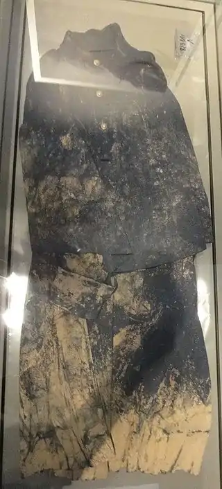 72e RI uniforme 1915 exposé à l'hôtel des invalides, la terre des tranchés est restée en l'état, l'uniforme appartenait à Henri Castaldi, mort aux combats en 1915.