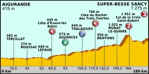 Après un début sans grande difficulté, l'étape se termine par l'ascension de Super-Besse. L'approche diffère de 2008 puisque le col de la Croix-Morand n'est pas franchi, mais est remplacé par le col de la Croix Saint-Robert, franchi par le Tour de France 1996 lors de la 14e étape. Le passage du col se fait dans le sens inverse avec un enchaînement direct avec l'arrivée.