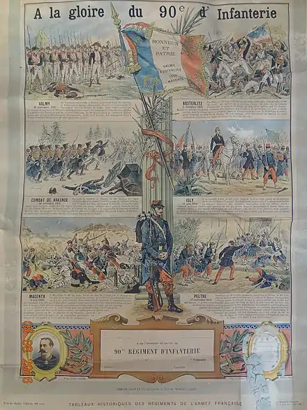 Affiche de 1892 présentant l'histoire du 90e régiment d'infanterie de ligne et du 15e régiment d'infanterie légère.