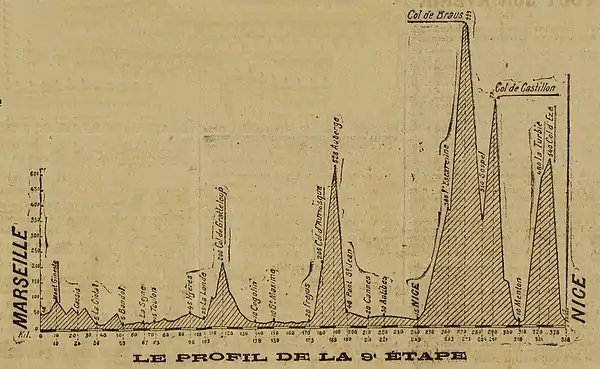 Les coureurs relient Marseille dans les Bouches-du-Rhône, à Nice, dans les Alpes-Maritimes au terme d'un parcours montagneux de 338 kilomètres.