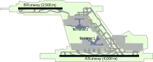 Il devait y avoir à l'ouverture trois pistes, une de 4 000 m, la seconde de 2 500 m et la troisième de 3 000 m mais, seule celle de 4 000 m demeure achevée jusqu'en 2002. La seconde piste est finalement ouverte mais elle ne fait que 2 180 m de long parce que l'expropriation nécessaire n'a pas abouti[3]. En cette piste, la 16L/34R, a pu être prolongée aux 2 500 m prévus. La finalisation d'une troisième piste de 3 200 mètres est à l'étude et serait située sur le côté des terminaux T1 et T2 néanmoins, l'aéroport se heurte toujours à la résistance d'agriculteurs ne souhaitant pas céder leurs terrains[3]. En 2023, des études reprennent avec le projet d'un grand terminal global[4] et la construction de la piste 3, etc.. L'objectif est de mener certains travaux à terme avec une inauguration envisagée en mars 2029.