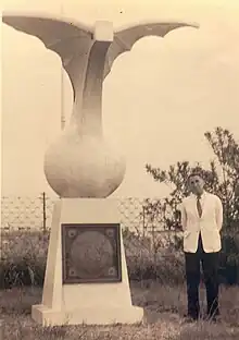 Max Dévé en 1956 devant le monument commémoratif du raid qui fut inauguré le 10 janvier 1937 à Tontouta.