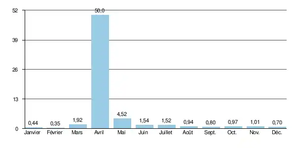 Les hautes eaux se déroulent brusquement en avril, et correspondent à la fonte des neiges. Dès le mois de mai, le débit de la rivière s'effondre rapidement, ce qui mène, après une brève transition, à la saison des basses eaux qui a lieu le restant de l'année, de juin à mars inclus, et durant laquelle les débits mensuels sont souvent minimes. Le débit moyen mensuel observé en février (minimum d'étiage) atteint 0,35 m3/s, soit moins de 1 % du débit moyen du mois d'avril (50,0 m3/s), ce qui montre l'extrême amplitude des variations saisonnières. Sur la période d'observation de 36 ans, le débit mensuel minimal a été de 0 m3/s (cours d'eau totalement à sec : notamment), tandis que le débit mensuel maximal s'est élevé à 238 m3/s (). Ces chiffres sont cependant assez exceptionnels.