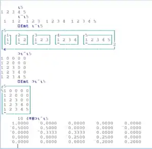 - ⎕←A←2 2⍴⍳4 ⍝ imprime une matrice A de taille 2x2 constituée des nombres de 1 à 4