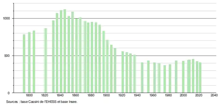L'évolution du nombre d'habitants est connue à travers les recensements de la population effectués dans la commune depuis 1793. Pour les communes de moins de 10 000 habitants, une enquête de recensement portant sur toute la population est réalisée tous les cinq ans, les populations légales des années intermédiaires étant quant à elles estimées par interpolation ou extrapolation[30]. Pour la commune, le premier recensement exhaustif entrant dans le cadre du nouveau dispositif a été réalisé en 2007[31].