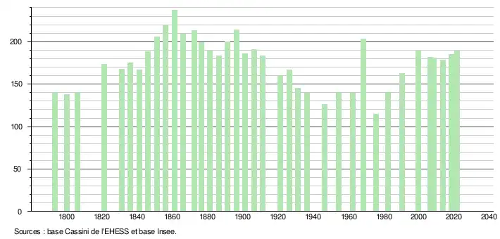 L'évolution du nombre d'habitants est connue à travers les recensements de la population effectués dans la commune depuis 1793. Pour les communes de moins de 10 000 habitants, une enquête de recensement portant sur toute la population est réalisée tous les cinq ans, les populations légales des années intermédiaires étant quant à elles estimées par interpolation ou extrapolation[44]. Pour la commune, le premier recensement exhaustif entrant dans le cadre du nouveau dispositif a été réalisé en 2008[45].
