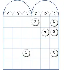 On dispose ainsi d'un abaque portatif constitué de gauche à droite de sept colonnes de 4+1 boutons (4 unaires et 1 quinaire pour compter les as en base 10), d'une colonne de 5+1 boutons (5 unaires et 1 sénaire pour compter les onces, c'est-à-dire les douzièmes d'as) et d'une colonne de 4 boutons (pour les subdivisions de l'once)[8].