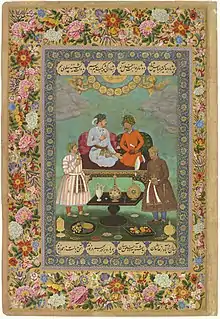 - en 1587, Chahzadeh (princesse) Oglan Pasha Khanoum, veuve de son frère aîné Hamza Mirza et fille de Chahzadeh (prince) Sultan Hussain Mirza.