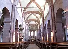 Si Rudolf Kautzsch (de) donne une chronologie différente, il conserve l’idée de la filiation entre les deux églises. Pour lui l’église du village a été reconstruite en plusieurs phases, avec un achèvement en 1145 : d’abord la nef commence à être remplacée, avec conservation des bas-côtés de l’église originelle, puis au début de la construction de la voûte d’arête de la nef, les plans auraient été changés pour en faire une voûte d’ogives ; enfin dans la phase finale l’abside est reconstruite[5].