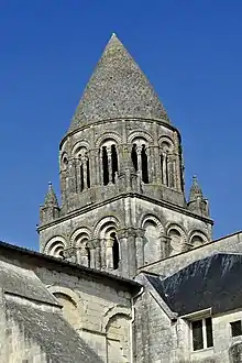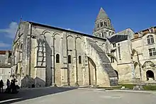 L'église abbatiale est caractéristique du style roman saintongeais. Elle se distingue notamment par la présence d'un clocher à base carrée, support d'une tour circulaire accostée de clochetons aux angles. Son couronnement à écailles inversées dit « en pomme de pin » rappelle l'Église Notre-Dame la Grande de Poitiers.