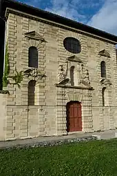 La façade de style classique XVIIe siècle est le principal centre d’intérêt de l’édifice, qui ne comporte par ailleurs aucun élément de décoration. Parfaitement symétrique, on a pu lui attribuer le qualificatif de « style Pompadour[1] », avec une ornementation classique d’inspiration antiquisante. Elle était construite en molasse, pierre locale très fragile, et était particulièrement dégradée, la partie centrale s’affaissant : le portail central étant muré a sauvé la façade d’une ruine totale. Elle a été restaurée en 2010. On ignore si les trois niches de cette façade ont été occupées par des statues.