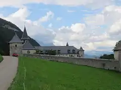 Abbaye de Tamié depuis la route du col, en arrière-plan la Sambuy.