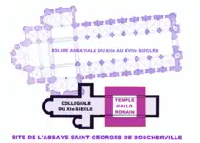 Le site de l'abbaye Saint-Georges de Boscherville est un lieu sacré depuis le Ier siècle de notre ère, époque à laquelle un temple carré à galerie en bois occupe le nord de la nef de l'église actuelle. Ce temple est remplacé, au IIe siècle, par un fanum à galerie et, dans la seconde moitié du XIe siècle, par une collégiale avec un cloître et des bâtiments en bois. La collégiale est arasée à partir de 1160 pour construire le nouveau monastère qui subit des modifications aux XVIe et XVIIe siècles, puis au XVIIIe siècle, les Mauristes construisent le grand bâtiment regroupant les fonctions régulières.