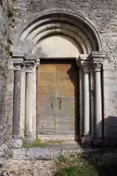 Le grand portail est dû à l'illustre prieur commendataire de l'abbaye, Julien Della Rovere, qui devint pape sous le nom de Jules II, et dont le blason surmonte le tympan qui fut dépouillé de ses trois statues en 1794.