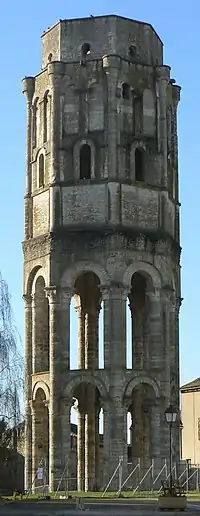 Elle fait 12 mètres de diamètre et 37 mètres de hauteur. Son plan est octogonal. La partie basse est constituée de huit piles quadrilobées reliées entre elles, à mi-hauteur par une série d'arcs en plein-cintre qui supportent les arcatures supérieures. L'élévation montre deux premiers niveaux d'arcades qui se trouvaient à l'origine à l'intérieur de l'église. Le bandeau de moellons signale l'appui de la voûte. La lumière entrait par les fenêtres hautes et éclairait l'autel, d'où son nom de tour-lanterne.