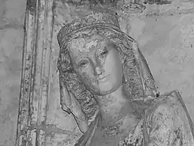 Le visage de Notre-Dame de Fontenelle, datant du début du XIVe siècle, montre des signes de réparation après les dommages infligés par le pillage de l'abbaye en 1562 par les huguenots.