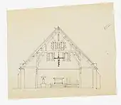 Marion Tournon-Branly, Coupe de l'ancienne grange dîmière de Canteloup, transformée en église abbatiale pour l'abbaye de Saint-Wandrille, 1967, Archives nationales (Fontainebleau), 20070572/89, no 121.