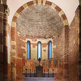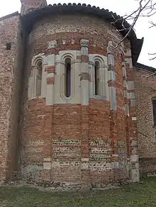 Par exemple, dans l'abside, on peut voir la fenêtre centrale qui présente un profil arrondi même dans la partie inférieure. Le nombre impressionnant de briques aux formes et aux tailles les plus variées, le dessin des pierres disposées en chevrons, dénotent d'ailleurs un goût presque exaspéré pour l’abstraction.