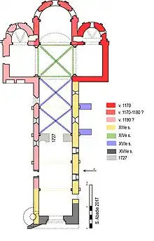 - plusieurs phases d'aménagements postérieures sont décelables : voûte de la croisée, tentative de voûtement de la nef, aménagements funéraires[13]...